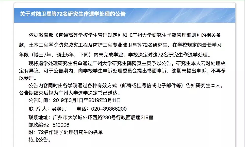 2019年3月,72名研究生在學校規定的最長學習年限(博士7年、碩士5年,下同)內未完成學業,學校決定對這72名研究生作退學處理。