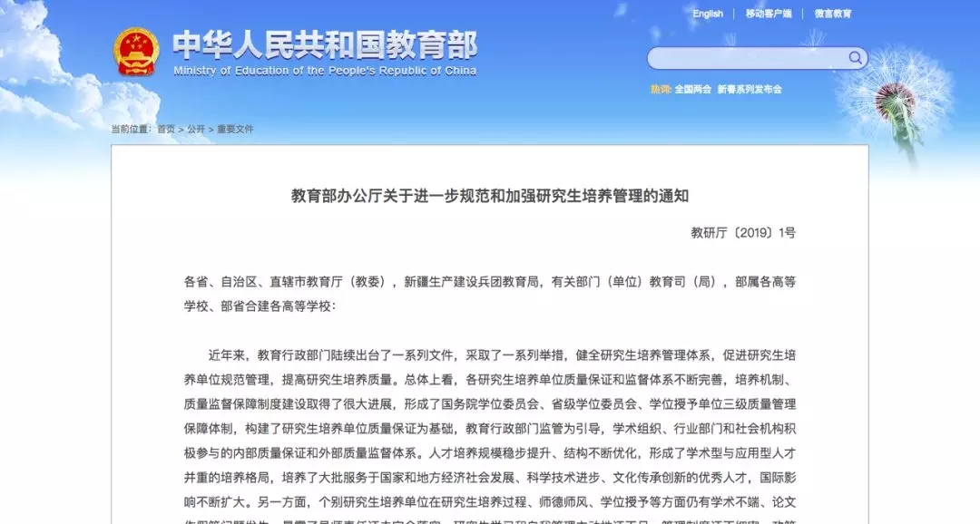此前,教育部辦公廳發布《關于進一步規范和加強研究生培養管理的通知》,分別就研究生考試招生和培養管理工作提出一系列更加嚴格的規范性要求。