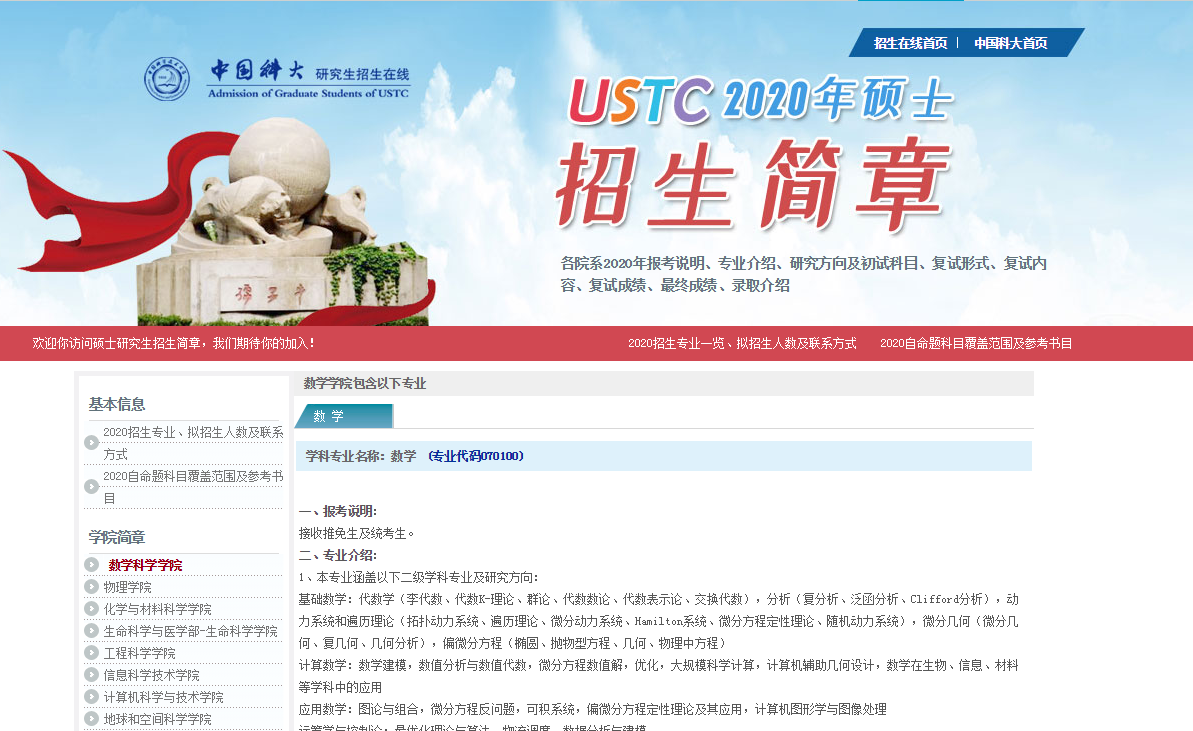 忙于備考的同時(shí),也應(yīng)該關(guān)注一下院校官方信息的發(fā)布,比如2020年研究生招生簡章。今天,小編整理了“中國科學(xué)技術(shù)大學(xué)2020年碩士招生簡章”的相關(guān)內(nèi)容!有相關(guān)報(bào)考意愿的同學(xué)注意一下!
