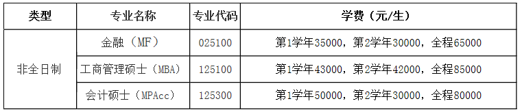 (2)非全日制工商管理碩士(MBA)專業每生全程學費85000元,非全日制會計碩士(MPAcc)專業每生全程學費80000元,非全日制金融碩士(MF)專業每生全程學費65000元。