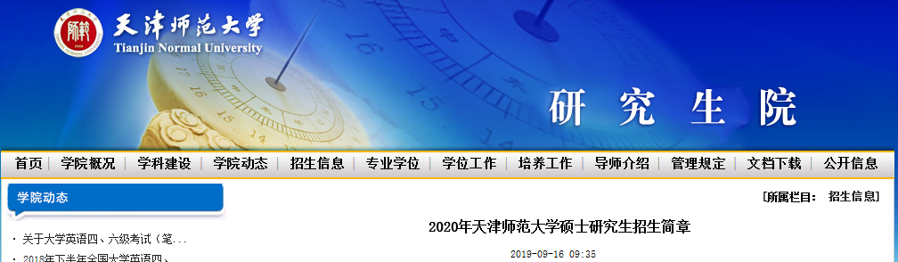 2020年碩士研究生招生簡(jiǎn)章陸續(xù)已出,今天小編給大家整理的是“2020年天津師范大學(xué)碩士研究生招生簡(jiǎn)章”的相關(guān)內(nèi)容,有報(bào)考意愿的小伙伴要注意下哦!