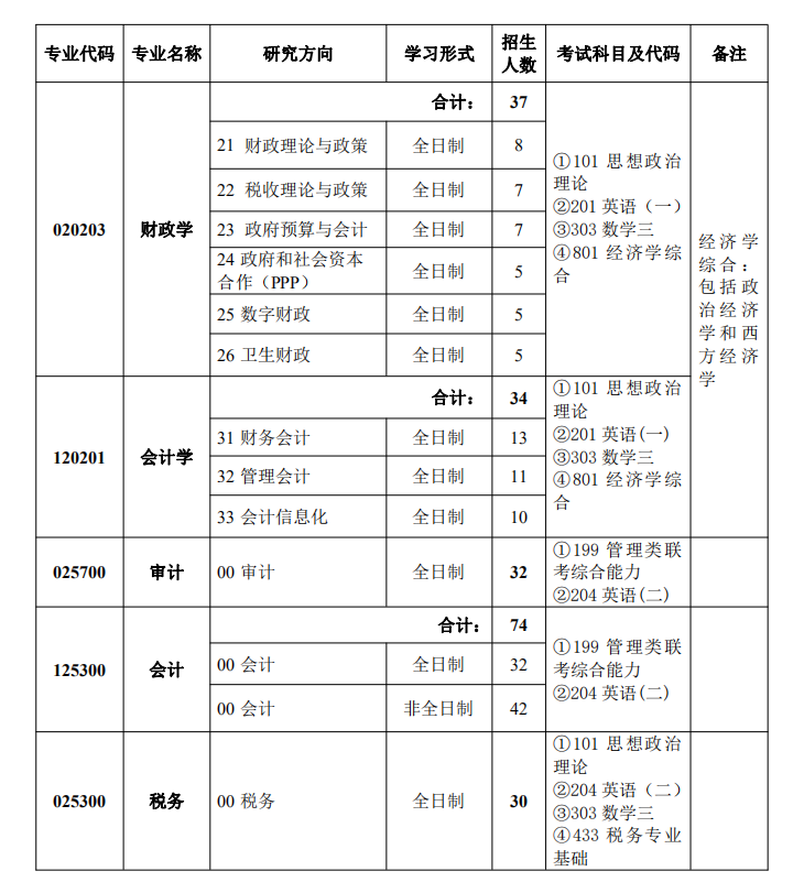 注:1.各專業(yè)(除非全日制會(huì)計(jì)專業(yè))名額均含推薦免試生及少數(shù)民族骨干計(jì)劃生,其中推免生總?cè)藬?shù)不超過(guò)招生總?cè)藬?shù)的50%。少數(shù)民族骨干計(jì)劃生名額分配:財(cái)政學(xué)6人、會(huì)計(jì)學(xué)3人、審計(jì)6人、全日制會(huì)計(jì)7人、稅務(wù)4人。少數(shù)民族骨干計(jì)劃招生事項(xiàng)詳見(jiàn)財(cái)科院《2021年“少數(shù)民族高層次骨干人才計(jì)劃”招收攻讀碩士學(xué)位研究生(全日制)招生簡(jiǎn)章》。