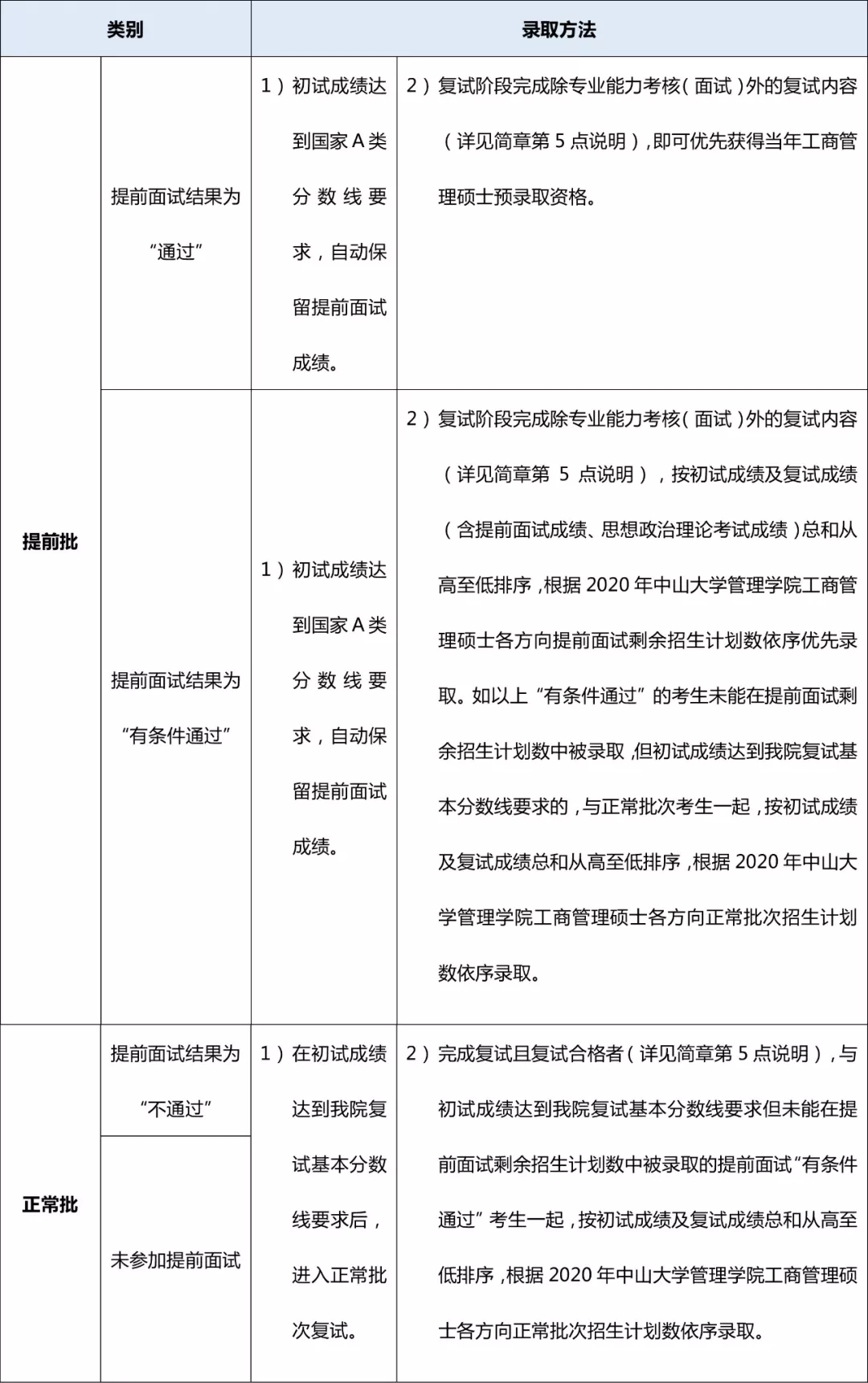 中山大學管理學院施行“提前批”和“正常批”招生,根據考生的初試成績、復試成績,并結合考生申請材料真實性復查、政審以及體檢結果,擇優錄取。