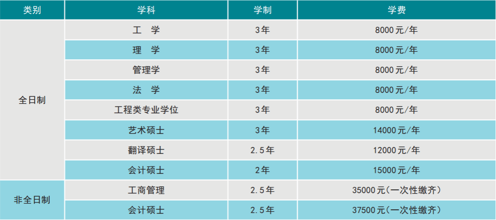 (二)非全日制(一次性繳納):會計碩士、工商管理碩士學制2.5年;翻譯碩士學制3年;工學專業學位學制均為3.5年;藝術碩士學制4年。學費按國家批準執行。