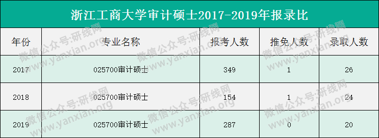 2020年的復試分數線和報錄比未確定,研線網整理了浙江工商大學審計碩士2017-2019年的報錄比,供大家參考。