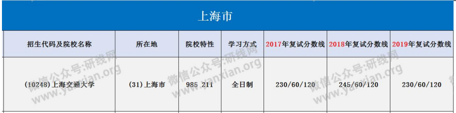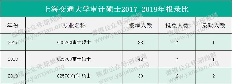 2020年的復(fù)試分?jǐn)?shù)線和報錄比未確定,研線網(wǎng)整理了上海交通大學(xué)審計碩士2017-2019年的報錄比,供大家參考。