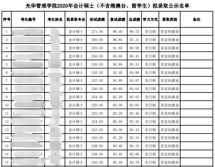 2020年會計專碩全日制擬錄取情況如下: