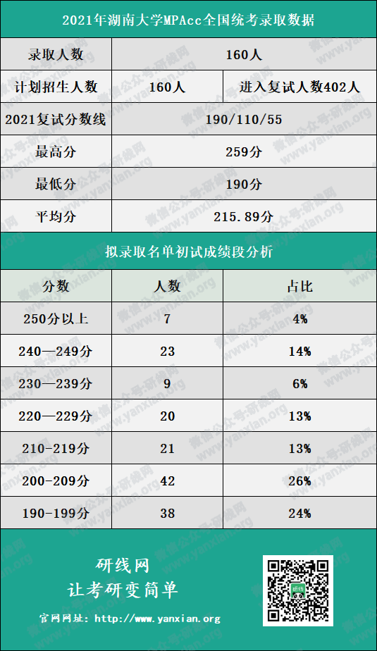 2021年湖南大學MPAcc計劃招生人數160人,進入復試人數402人,擬錄取碩士研究生160人。