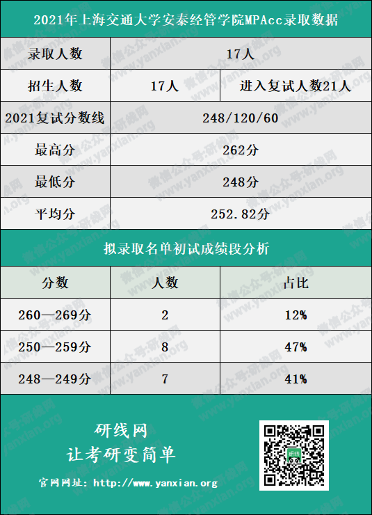 上海交通大學安泰與經濟管理學院2021年會計專碩招生計劃為17人,進入復試人數為21人,擬錄取人數為17人。