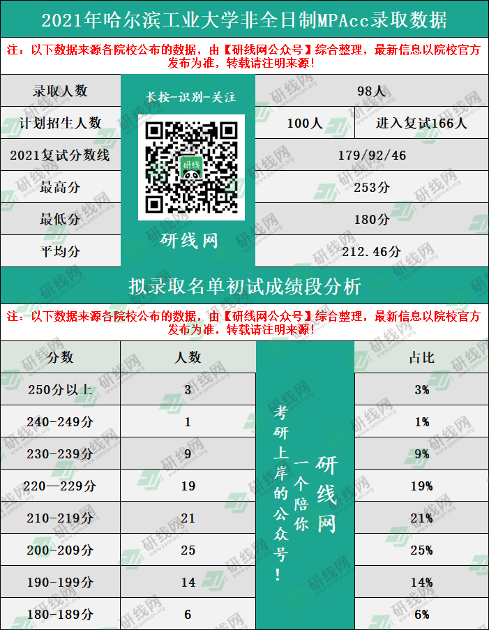 2021年哈爾濱工業大學非全日制MPAcc計劃招生人數100人,進入復試166人,擬錄取碩士研究生98人。