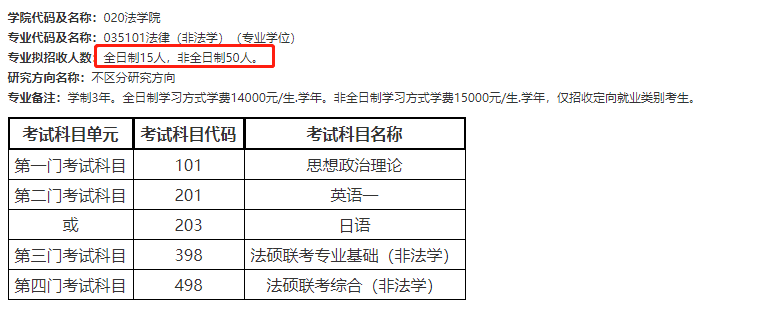 2021年法碩(非法學)全日制招生人數是15人,非全日制50人