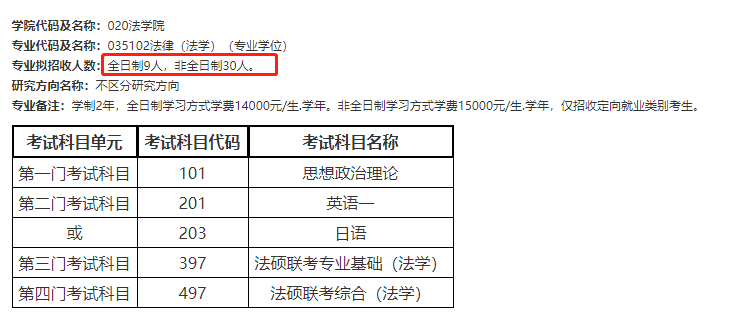 2021年法碩(法學)全日制招生人數是9人非全日制招生30人