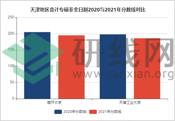 如上圖所示,天津地區(qū)天津工業(yè)大學(xué)和南開大學(xué)2021年會計專碩非全日制分數(shù)線較2020年都有明顯變化,南開大學(xué)降低了10分,天津工業(yè)大學(xué)降低了12分。