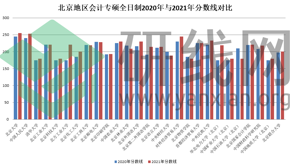 北京地區(qū)會計專碩全日制2020年與2021年復(fù)試分?jǐn)?shù)線對比如下: