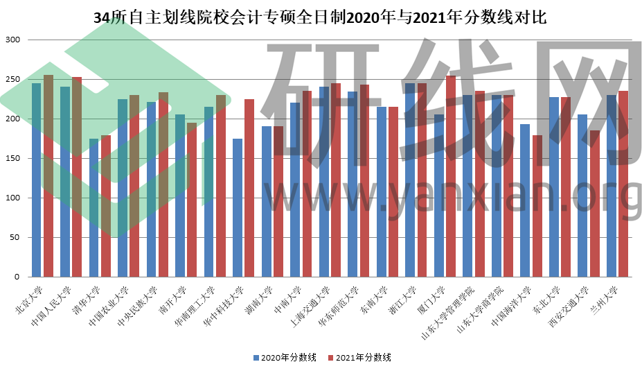 34所自主劃線院校會計專碩全日制2020年與2021年復試分數線對比如下:
